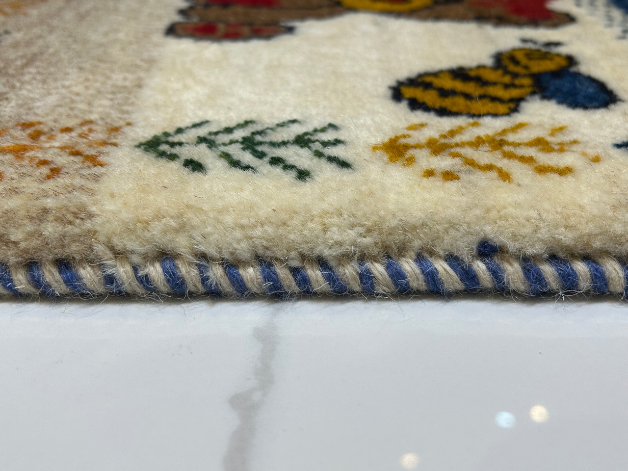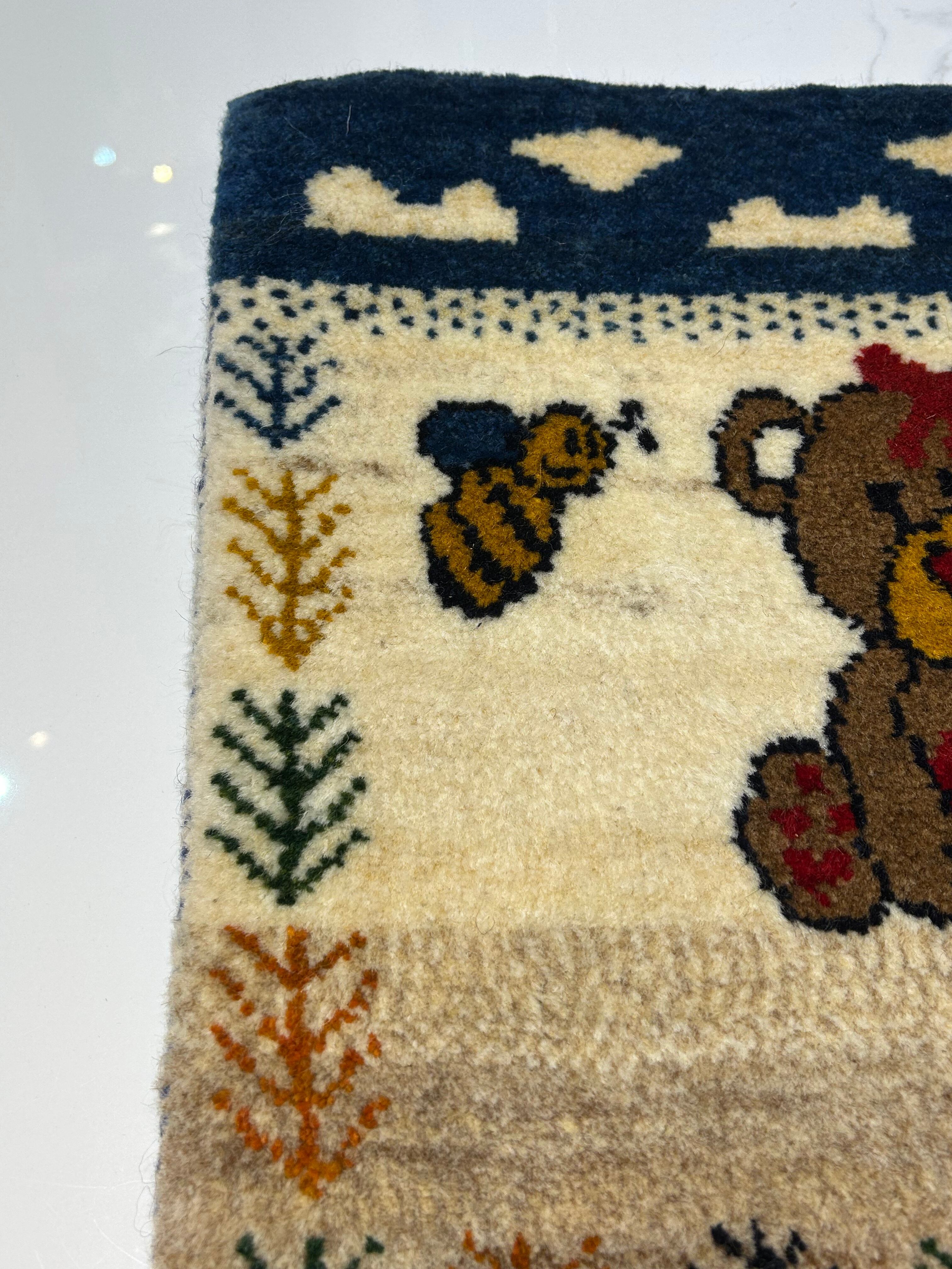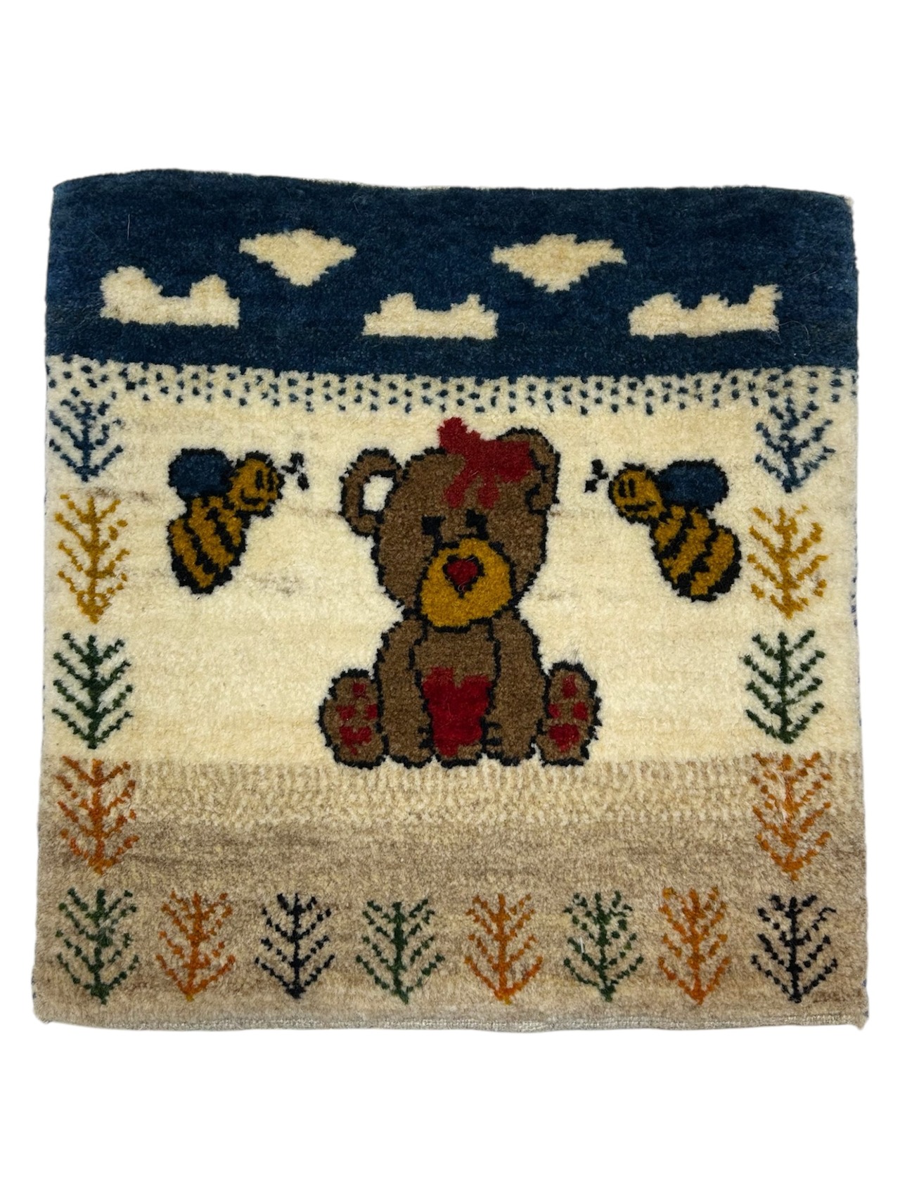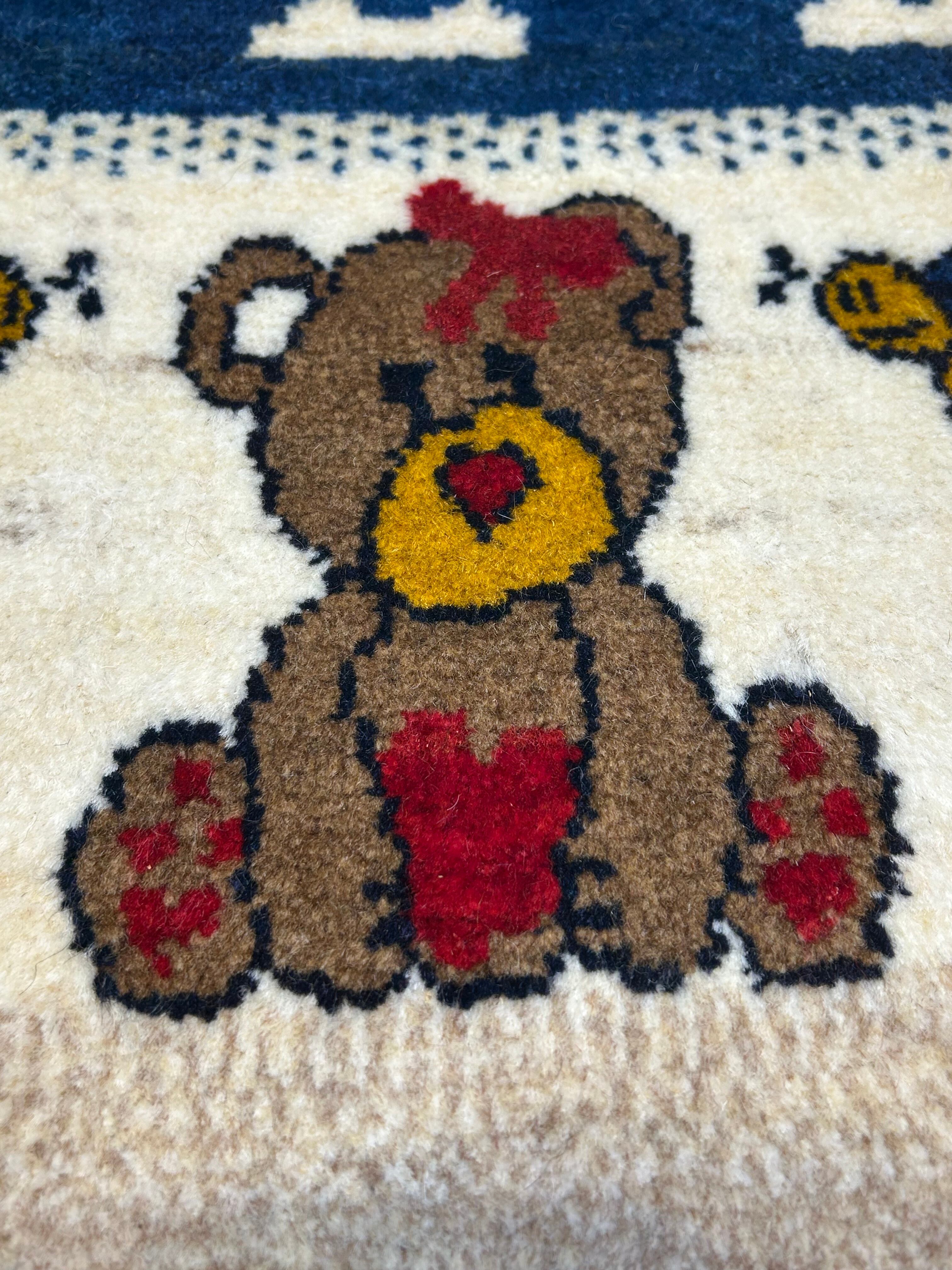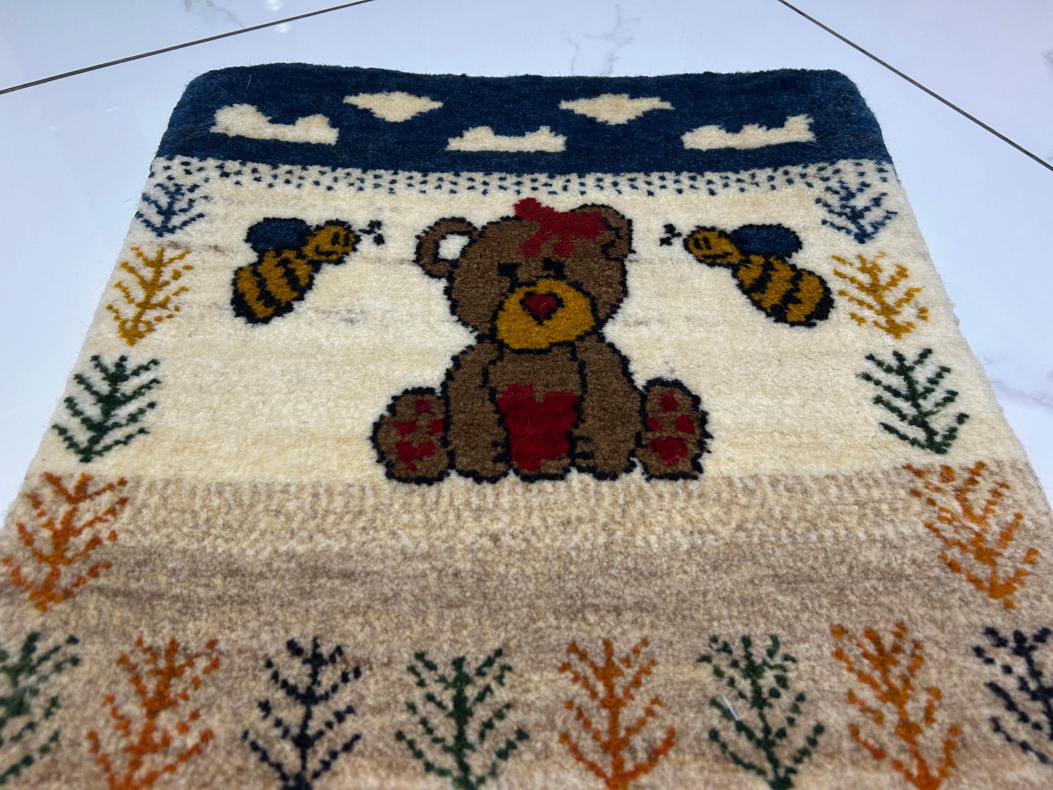 ウール100%を使用し、可愛いくまのデザインが特徴な、イランのSHIRAZ産の手織りギャッベです。