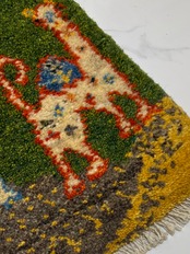 GABBEH「ラクダ」模様ウール100%草木染めのSHIRAZ産絨毯は、伝統的な技法によって丁寧に織り上げられた特別な一品です。草木染めによる温かみのある色合いと、シンボリックなラクダのデザインは、空間に豊かさと落ち着きをもたらします。サイズは約44x42cm(房含まず)で、様々な場所にフィットし、インテリアのアクセントとして最適です。