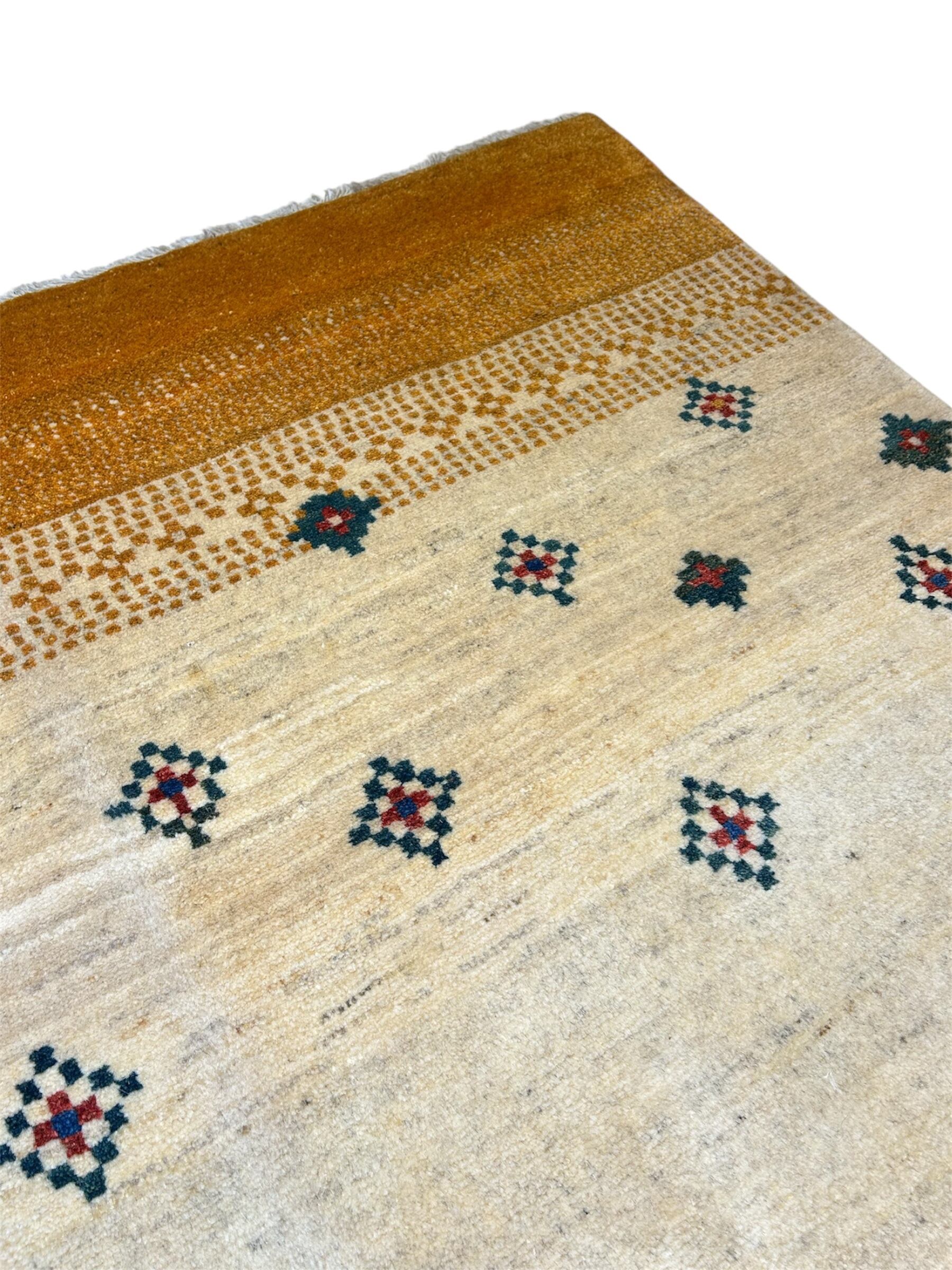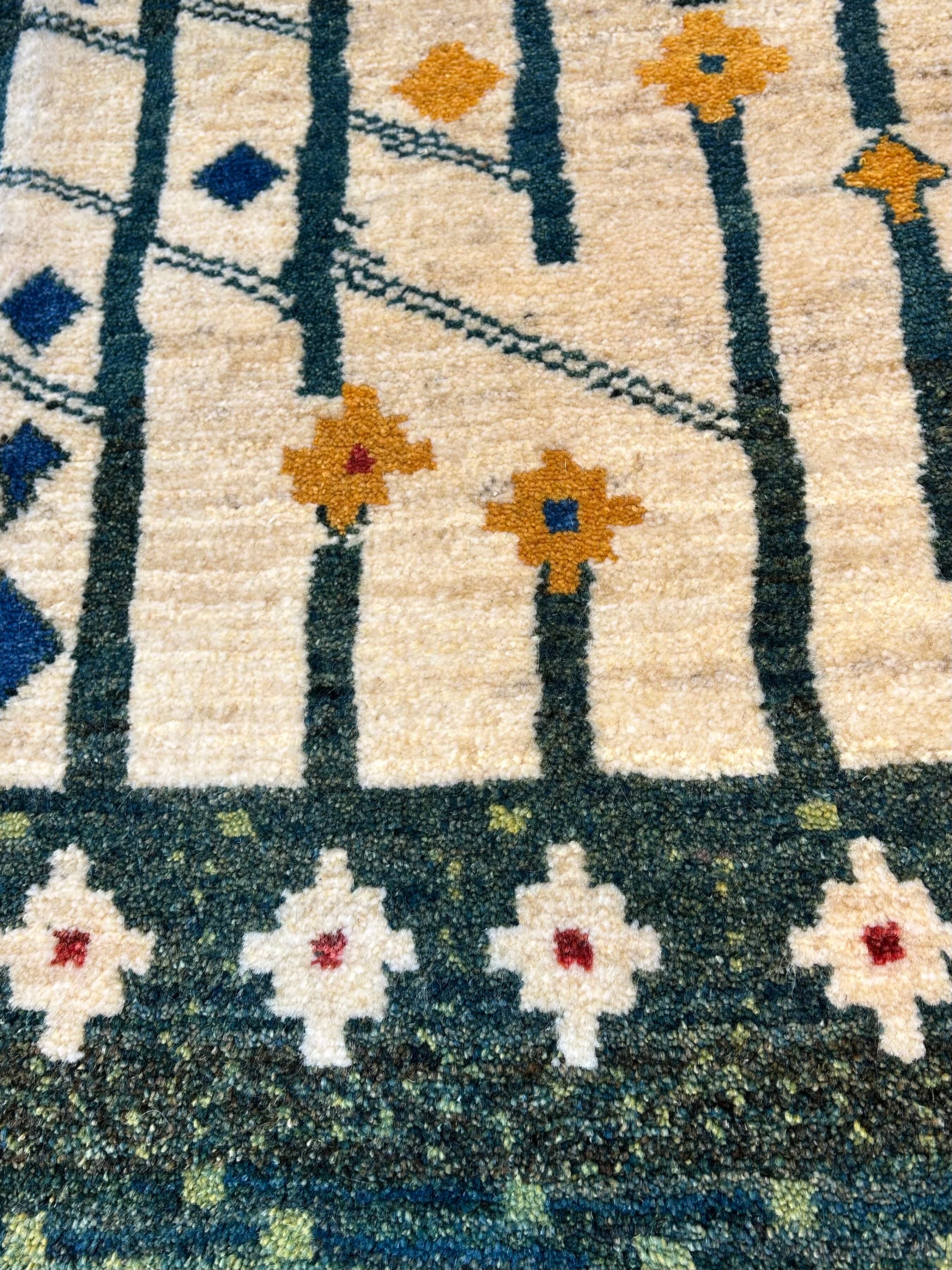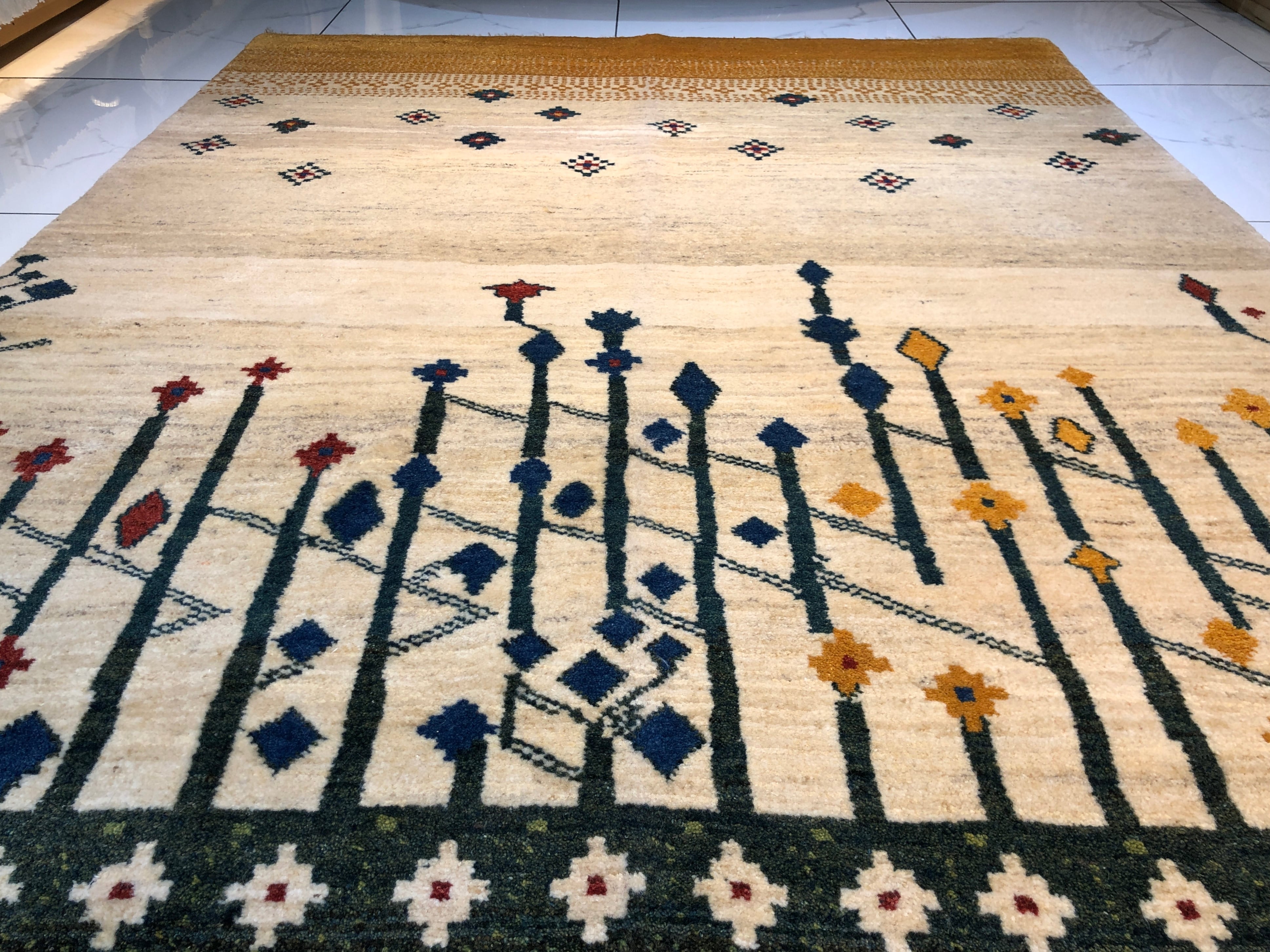 ウール100%を使用し、イランSHIRAZ産の手織りギャッベです。「生命の樹と花」をモチーフにした美しいデザインが特徴で、高品質なウールにより、柔らかな手触りと優れた耐久性を兼ね備えています。お部屋を温かく彩る存在感あるアイテムです。