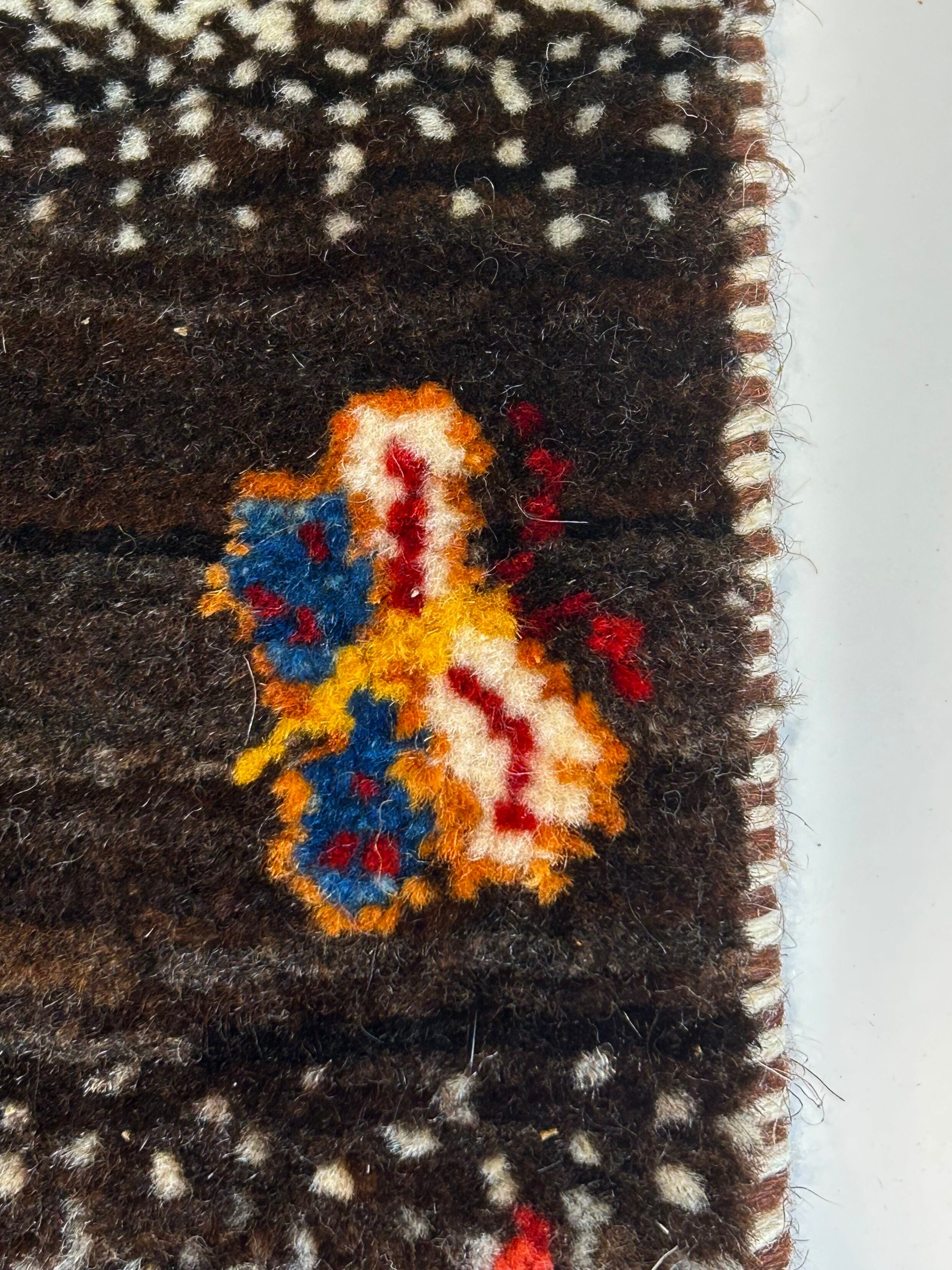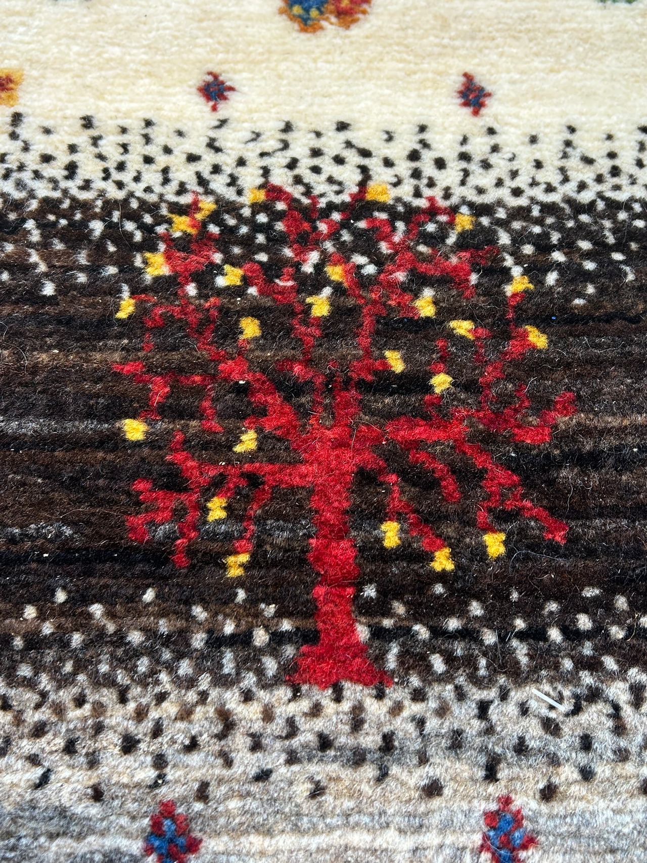ウール100%を使用し、イランSHIRAZ産の手織りGABBEHです。「生命の樹と蝶」をモチーフにした美しいデザインが特徴で、高品質なウールにより、柔らかな手触りと優れた耐久性を兼ね備えています。彩り豊かな色合いと豊かな表情が、お部屋の雰囲気を一層引き立てます。 サイズは約45x42cm(房含まず)で、さまざまな場所にぴったりフィットします。