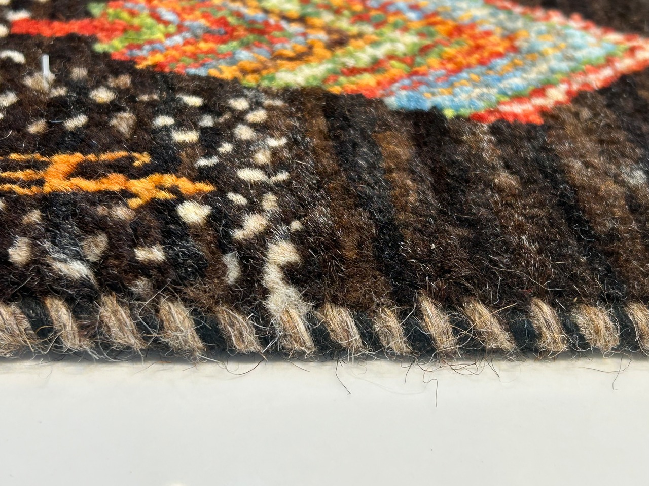 ウール100%を使用し、イランSHIRAZ産の手織りGABBEHです。「生命の樹と蝶」をモチーフにした美しいデザインが特徴で、高品質なウールにより、柔らかな手触りと優れた耐久性を兼ね備えています。彩り豊かな色合いと豊かな表情が、お部屋の雰囲気を一層引き立てます。 サイズは約41x41cm(房含まず)で、さまざまな場所にぴったりフィットします。